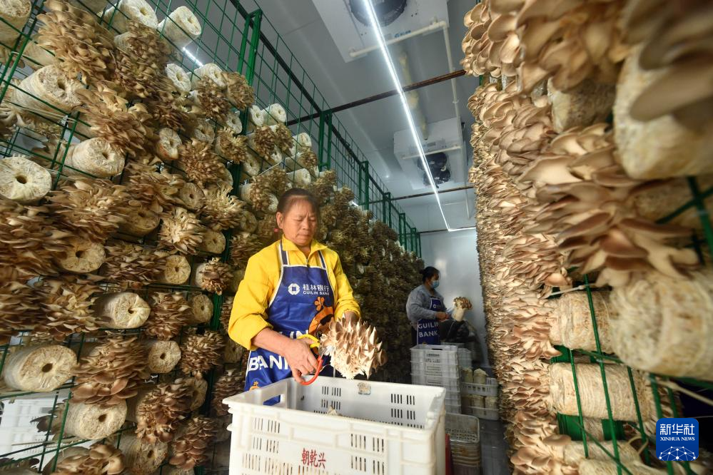 在广西百色市德保县城关镇那造村食用菌生产基地,村民在智能小方舱里采摘蘑菇(10月31日摄)。