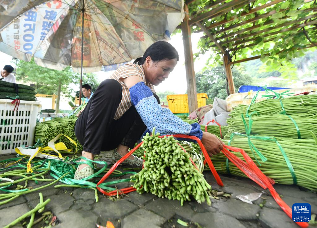 2024年5月25日,觉山村村民在整理豆角,准备供应市场。