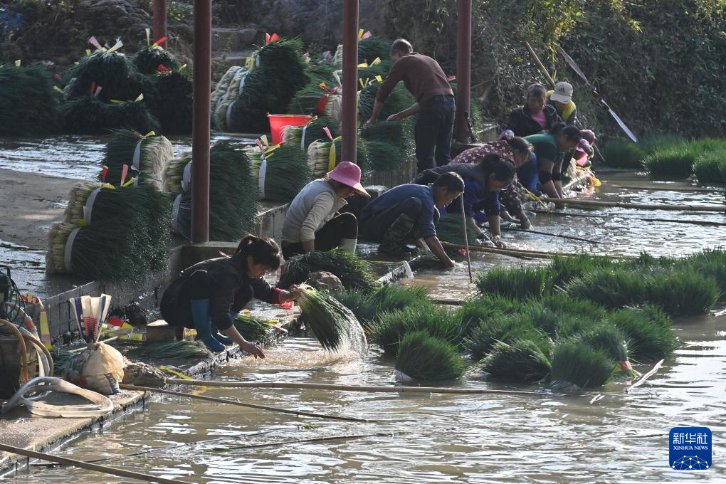 2024年11月2日清晨,觉山村村民在挑选香葱。