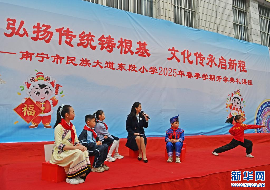 2月17日,南宁市民族大道东段小学举行主题为“弘扬传统铸根基 文化传承启新程”的2025年春季学期开学仪式。这是一名孩子在表演武术。