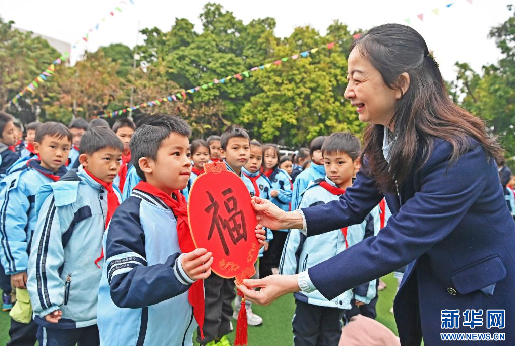 2月17日,南宁市民族大道东段小学举行主题为“弘扬传统铸根基 文化传承启新程”的2025年春季学期开学仪式。这是校长罗莹(右)给孩子送“福”字。
