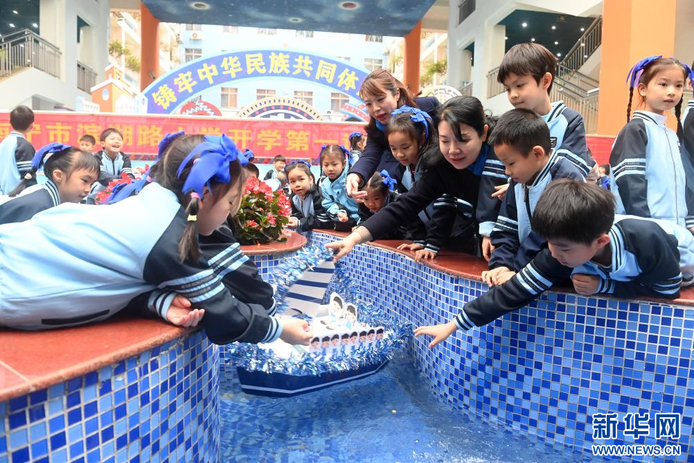 2月17日,广西南宁市滨湖路小学师生将“梦想船”放入水中寄语新学期。