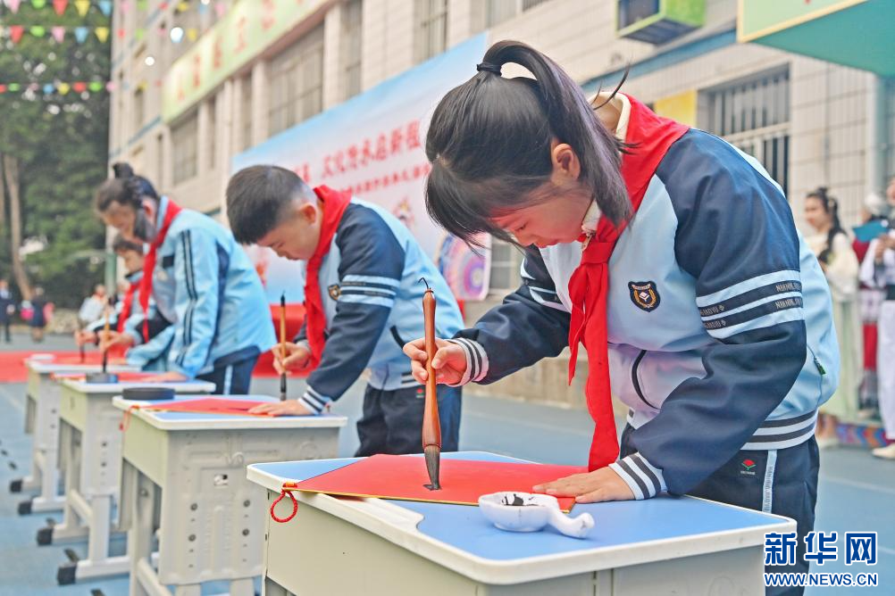 2月17日,南宁市民族大道东段小学举行主题为“弘扬传统铸根基 文化传承启新程”的2025年春季学期开学仪式。这是孩子们在写“福”字。