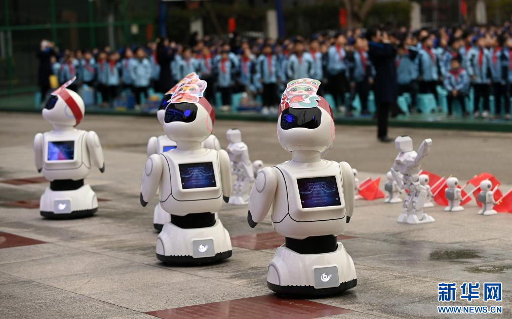 2月17日,机器人在广西南宁市滨湖路小学开学典礼上表演。