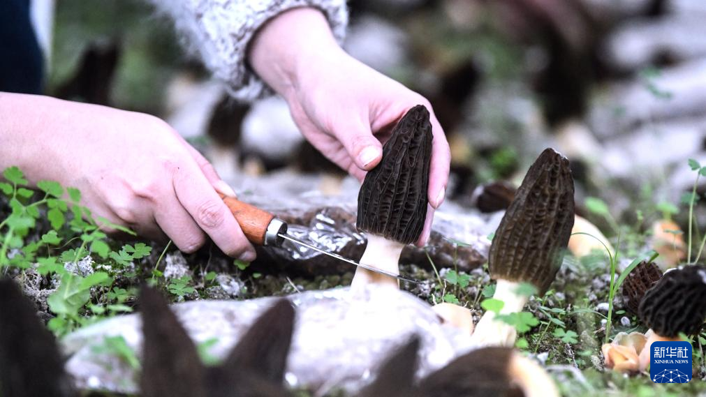 2月28日,在广西三江侗族自治县丹洲镇江荷村,一名年轻人在采收羊肚菌。