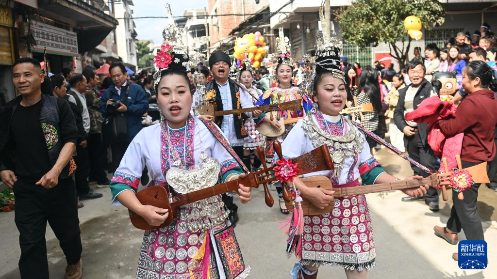 3月1日,在广西三江侗族自治县梅林乡,参加“二月二”庆祝活动的侗族群众在沿街巡演。