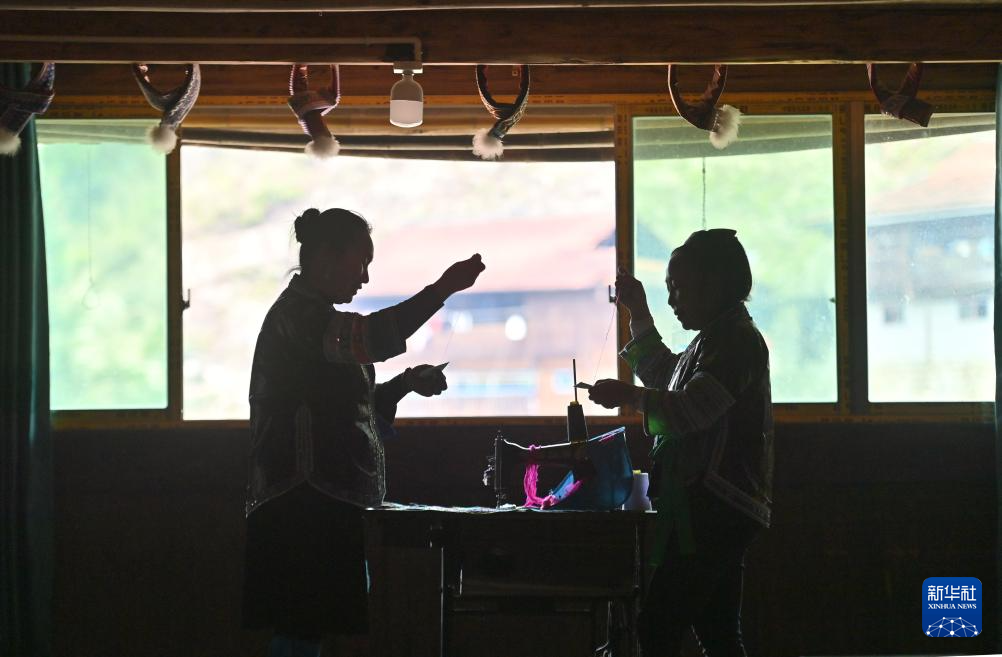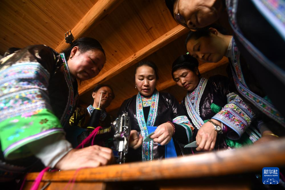 在广西柳州市融水苗族自治县杆洞乡杆洞村,杨洪英(右)在苗衣制作基地工作(2月27日摄)。