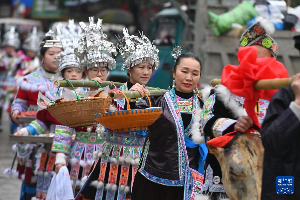 在广西柳州市融水苗族自治县杆洞乡杆洞村,杨洪英(右二)在参加百鸟衣芦笙坡会(2月5日摄)。