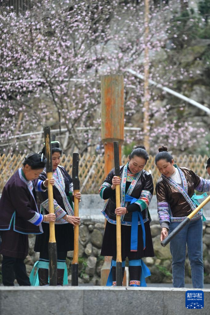 在广西柳州市融水苗族自治县杆洞乡杆洞村,杨洪英(左一)在练习苗族舞蹈(3月3日摄)。