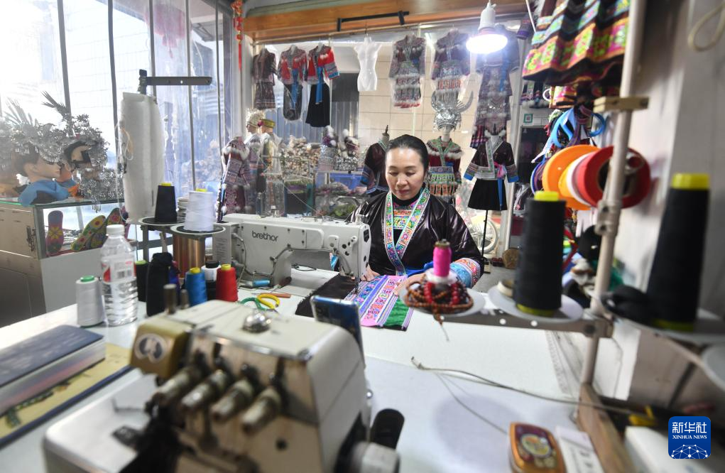 在广西柳州市融水苗族自治县杆洞乡杆洞村,杨洪英在苗衣制作基地工作(3月4日摄)。