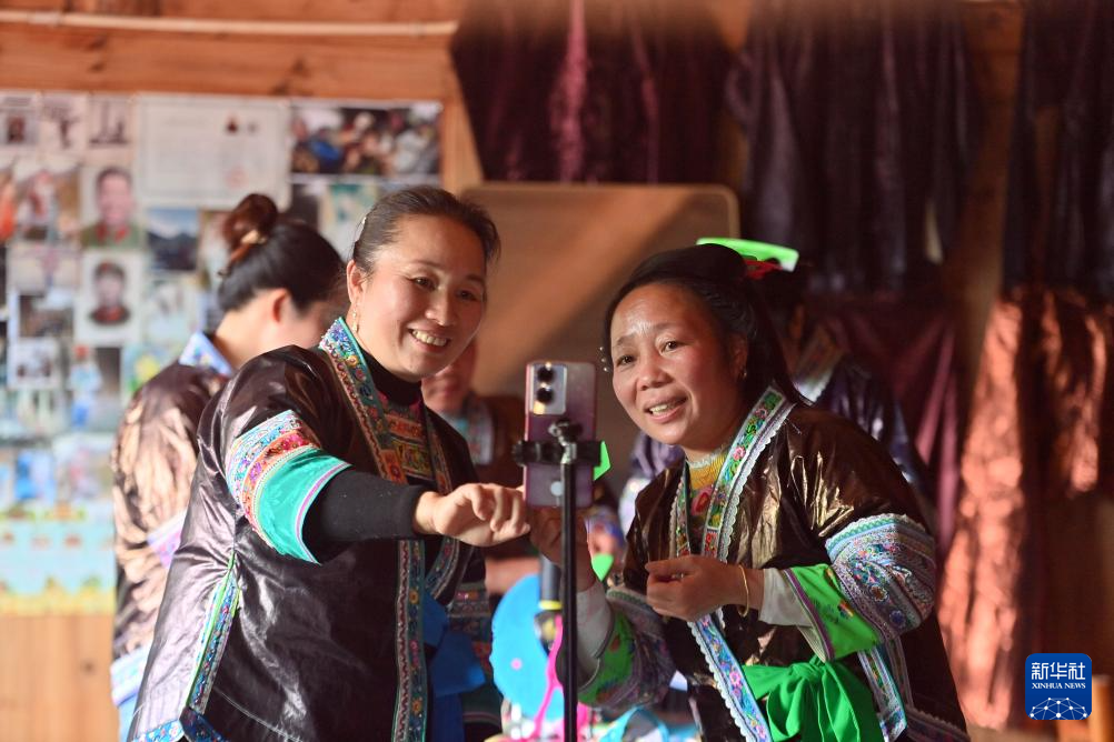 在广西柳州市融水苗族自治县杆洞乡党鸠村,杨洪英(左)向网友展示苗族刺绣技艺(3月3日摄)。