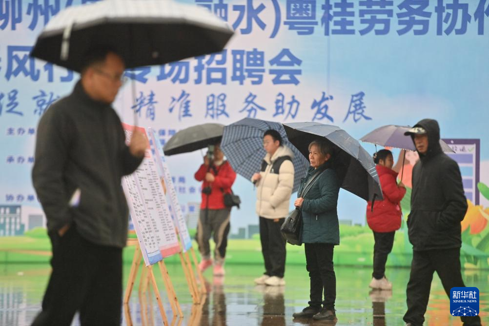 当日,广西柳州市融水苗族自治县举行粤桂劳务协作暨春风行动专场招聘会,两地60多家企业共提供数千个工作岗位,吸引众多求职者冒雨前来应聘。