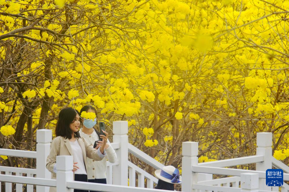 3月14日,游客在广西南宁市青秀山风景区观赏黄花风铃木。