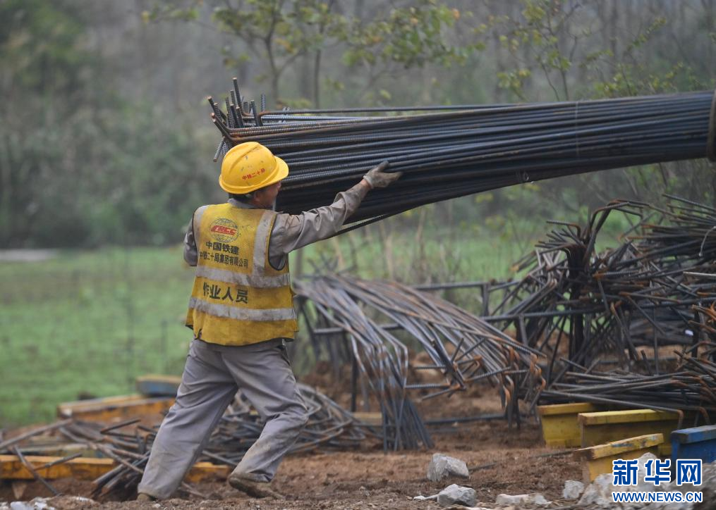 中铁二十局的工人在柳州市柳江区三都镇鱼宜高速公路建设工地作业(3月14日摄)。