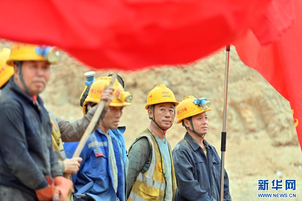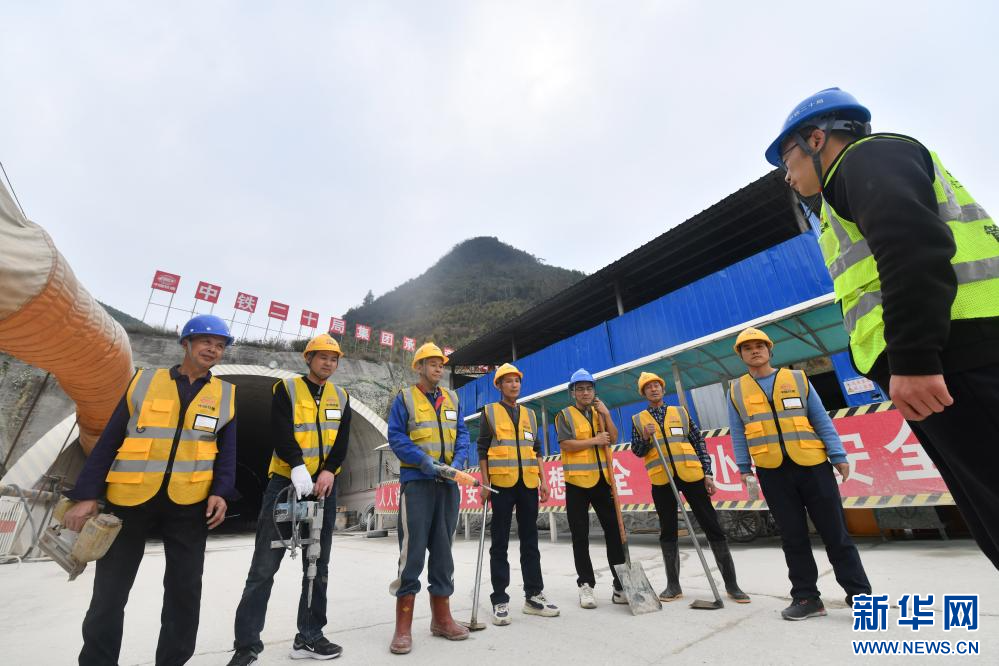 柳州市柳江区三都镇鱼宜高速公路建设工地,中铁二十局的工人准备庆祝果福隧道贯通(1月8日摄)。