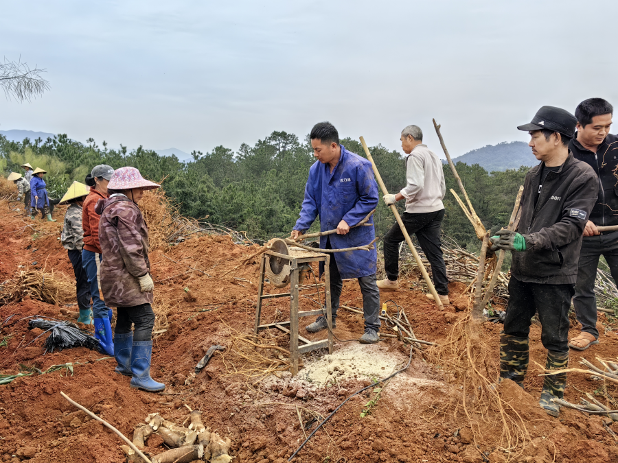 近日,在防城港东兴市江平镇那漏村五指毛桃种植基地,那漏村村委组织30多名村民进行五指毛桃采收工作。两台挖掘机分别沿着整齐的地垄把一棵棵成熟的五指毛桃挖出来,工人们跟在后面忙着清理泥土、修剪、捆扎、装车。
