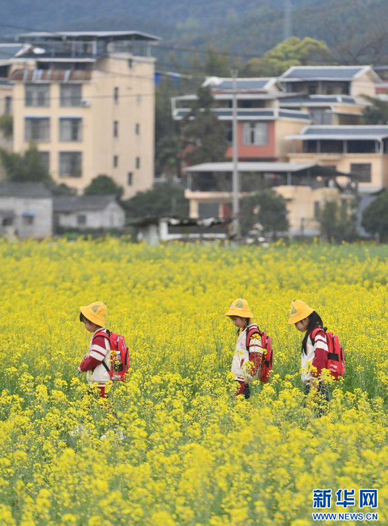 在广西融水苗族自治县融水镇新国村,小朋友在油菜花地踏青游玩(3月21日摄)。