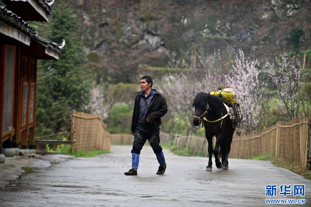 在广西融水苗族自治县杆洞乡党鸠村,村民劳作归来(3月12日摄)。