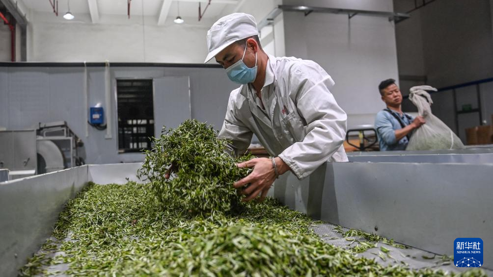 3月22日,在三江县御香茶业有限公司车间,工人在处理收购的茶青。