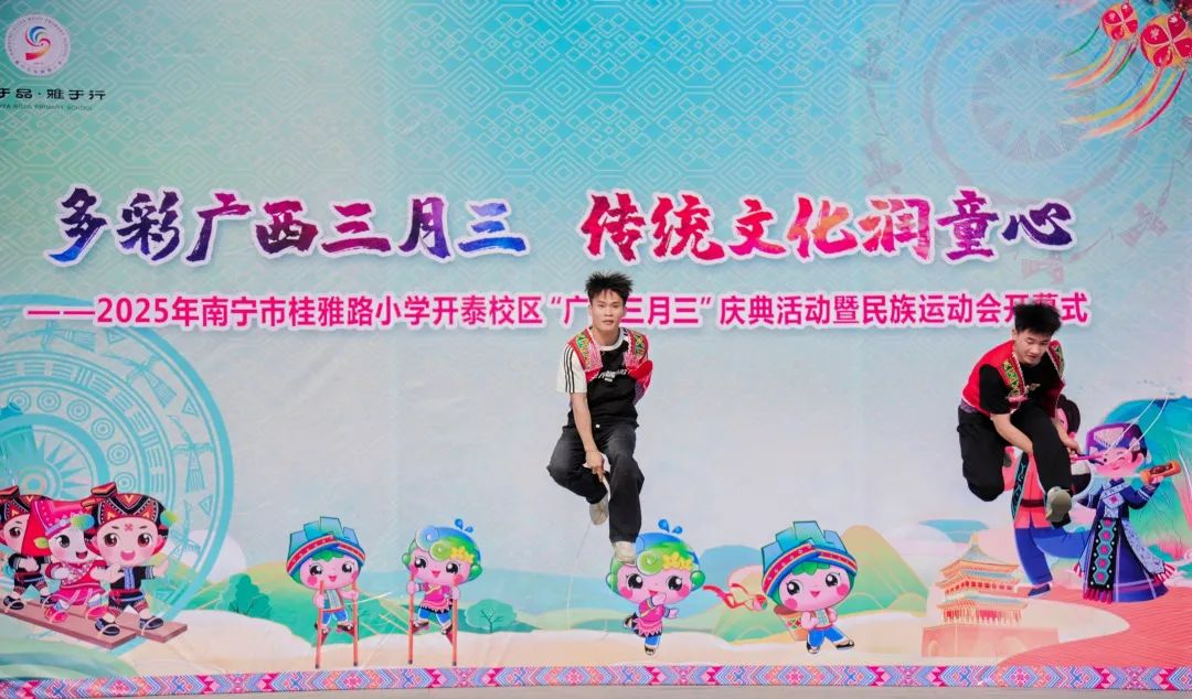 学校合唱团的小阿哥和小阿妹们通过《壮乡敬酒歌》的歌声,传递着广西各族儿女的热情。在民族体育项目展示环节,高杆绣球、踩高跷、滚铁环等传统运动轮番登场,生动诠释了民族体育运动项目的精神内涵。学校特邀的花样跳绳教练以翻飞的彩绳和灵动的舞姿赢得阵阵掌声。在舞蹈环节,闪闪啦啦操队的同学们将民族元素融入啦啦操舞蹈《呗侬情深》,呈现出独特的舞蹈韵味。