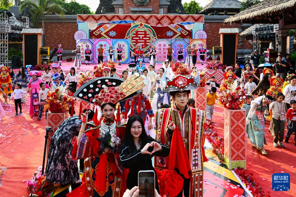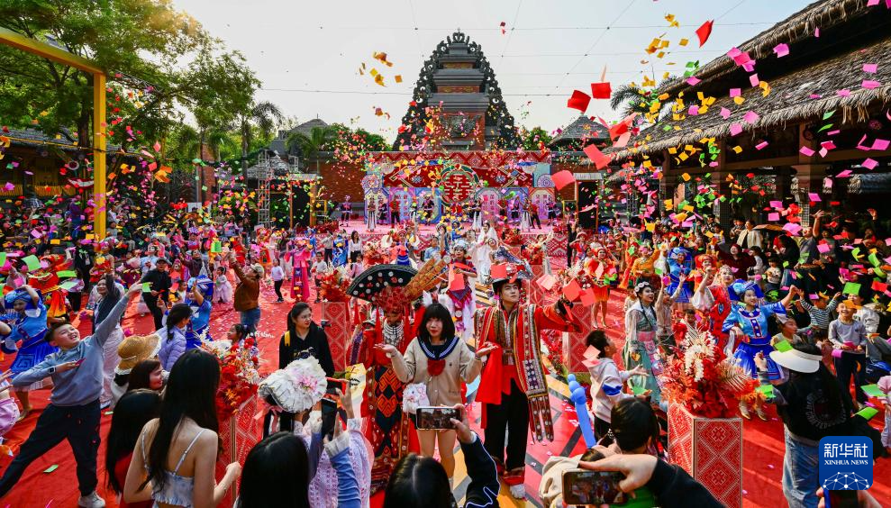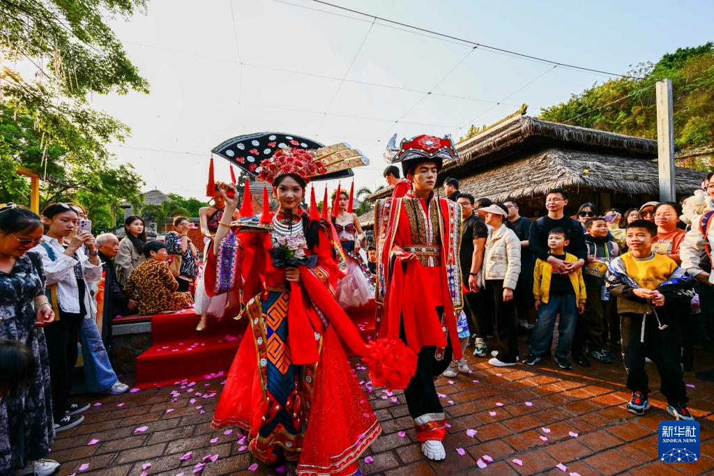 “三月三”期间,广西南宁方特东盟神画乐园举行“壮婚大典”民俗表演,吸引众多游客前往体验民族风情,感受传统文化。