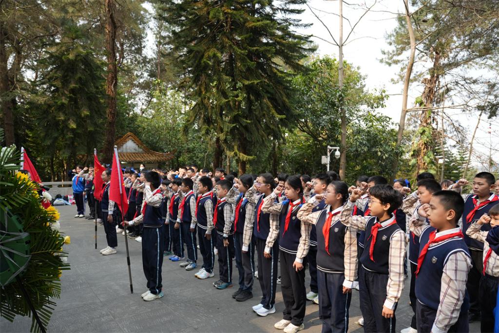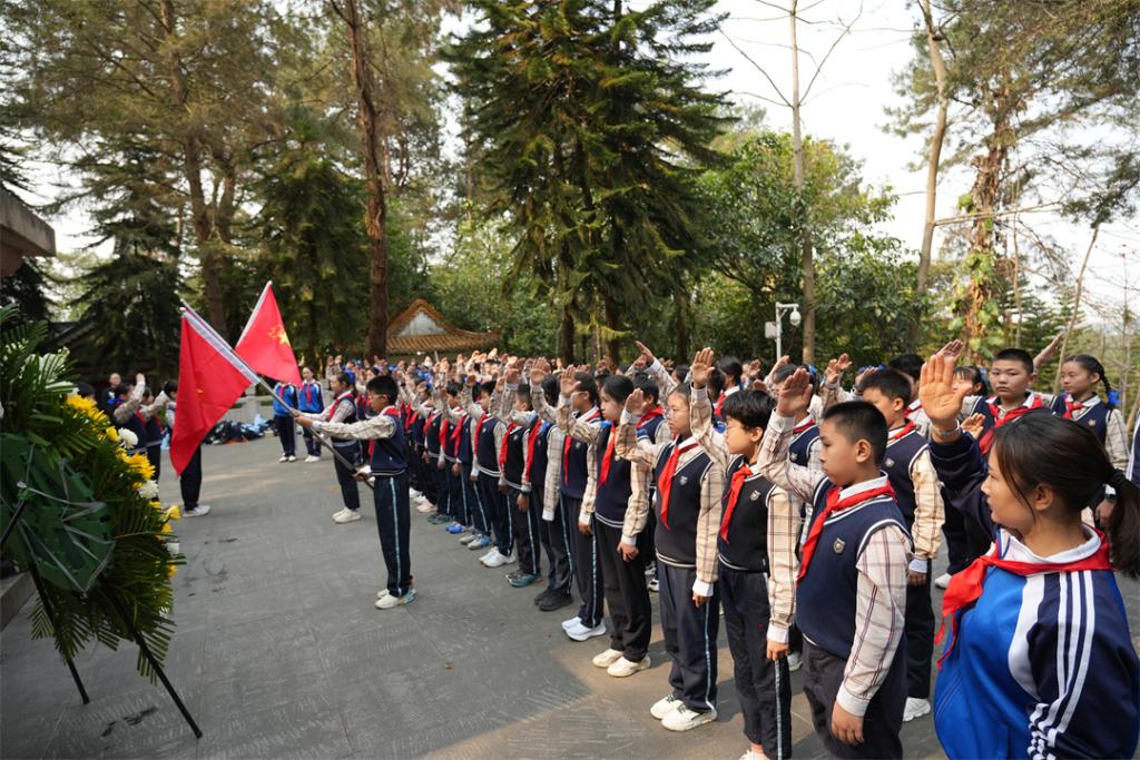 “请举起右拳,跟我宣誓!”大队辅导员梁秋梦老师的声音高亢有力。全体队员齐声高呼:“继承先烈遗志,弘扬革命精神,努力学习,争做新时代好队员!”誓言在山间回荡,红领巾在春风中飞扬,这一刻,信仰的种子在少年中生根发芽。