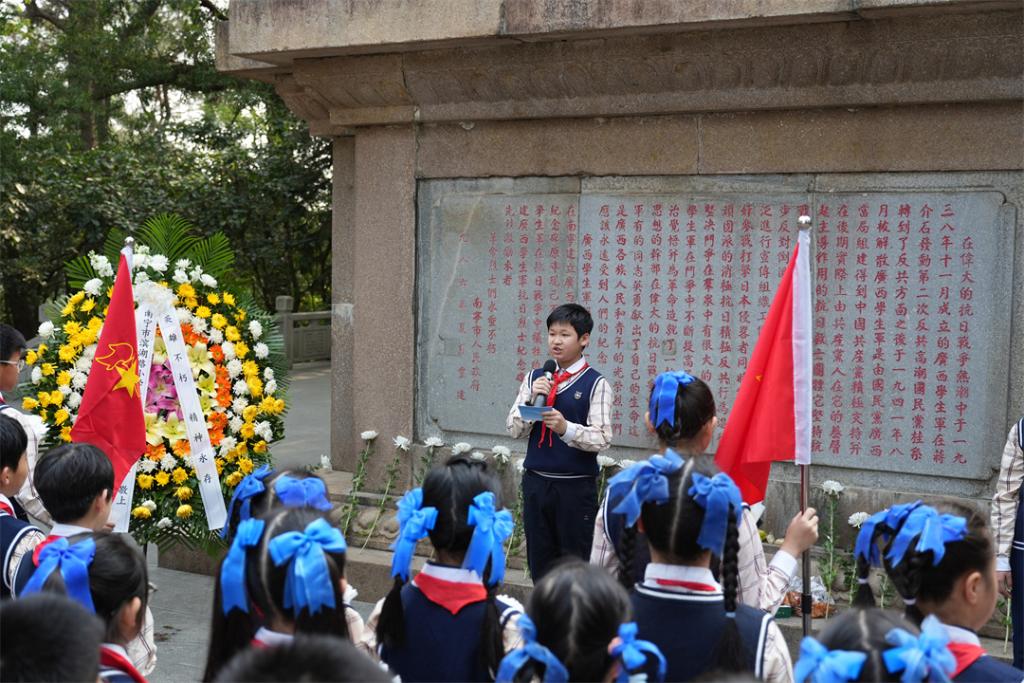 “同学们,我们胸前的红领巾在春风中飘扬,手中的白菊在阳光下绽放,我们究竟是在缅怀一群什么样的人?其实他们比我们大不了多少岁,为抵抗日本侵略,上世纪三十年代,数千广西学子报名参军,他们中最小的只有12岁,最大的不过20岁……”五(2)中队代表用铿锵的声音,讲述了一位13岁小姑娘用稚嫩的肩膀扛起保家卫国重任的故事。约3分钟的讲述中,队员们屏息凝神,有人悄悄攥紧了拳头,有人眼眶泛红。
