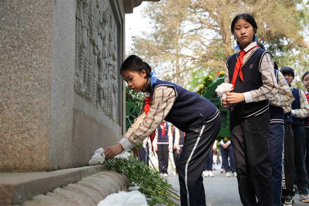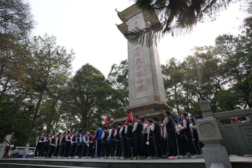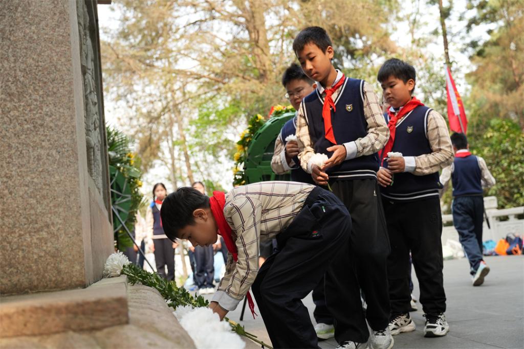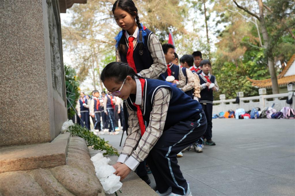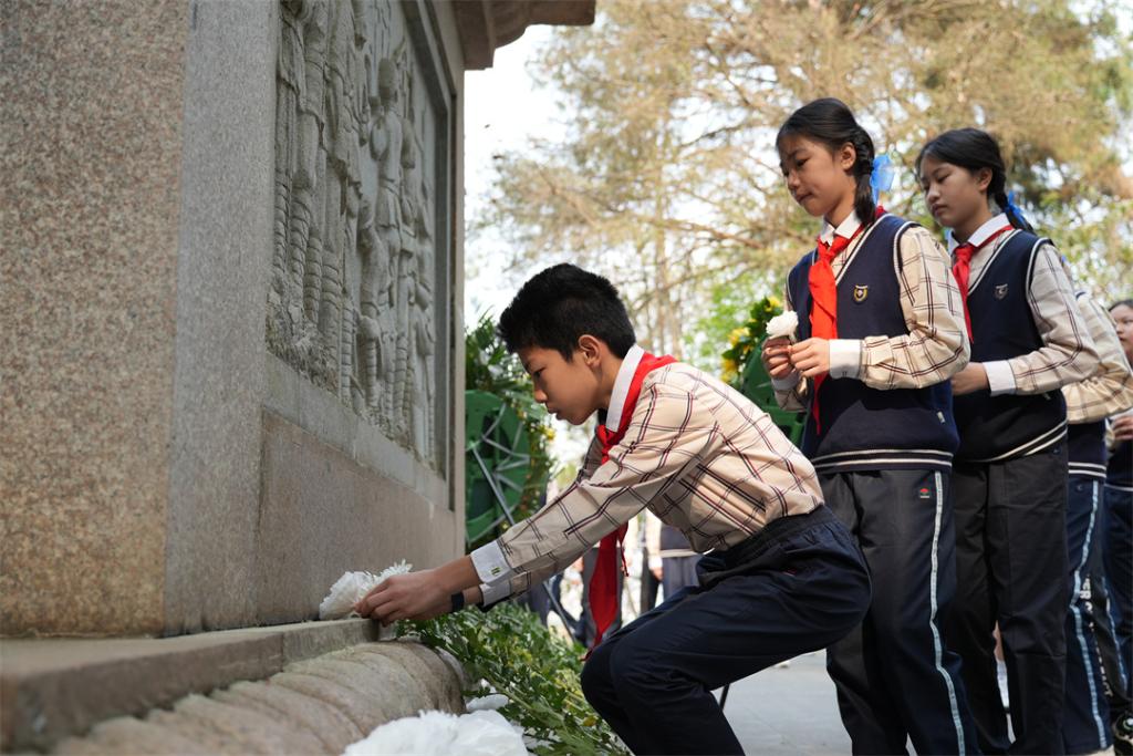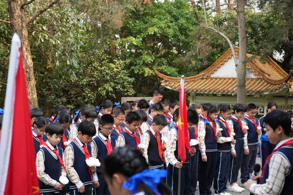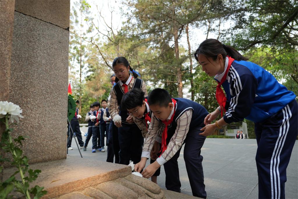祭扫中,队员们依次上前,将小白花轻轻放在纪念碑基座上,一朵朵白花,承载着孩子们的纯真敬意,也象征着革命精神代代相传。轻风拂过,白花如雪,无声的对话跨越时空。