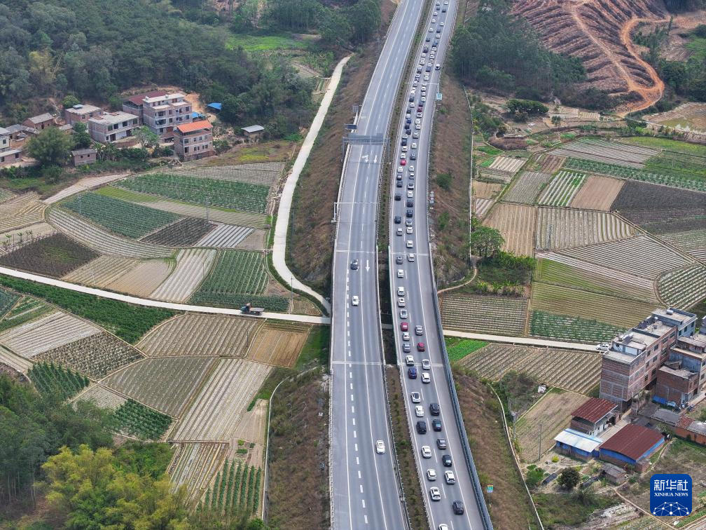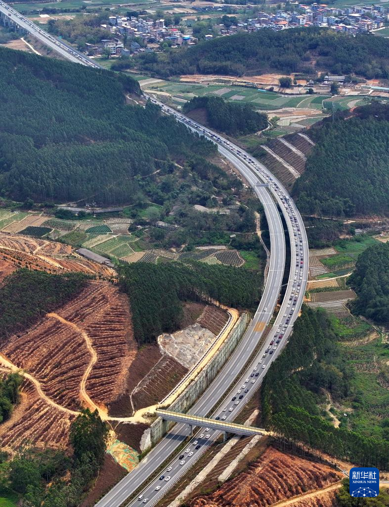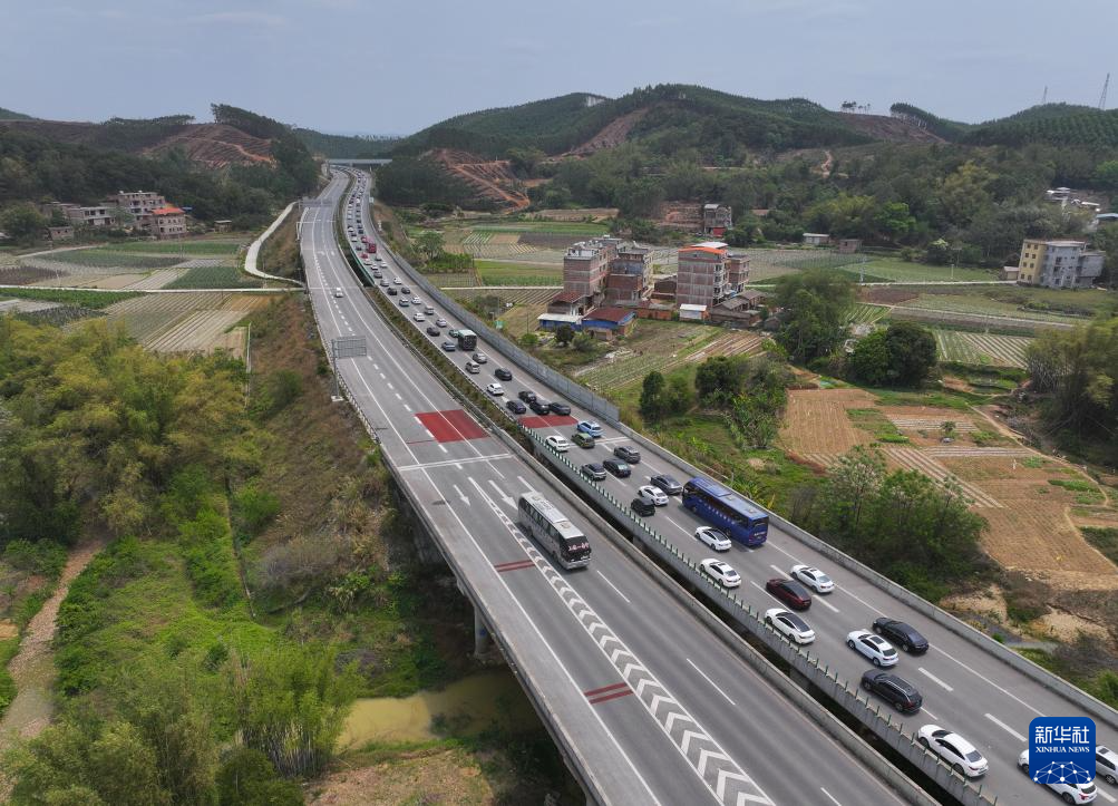 4月4日,车辆在广西三南高速南宁出城方向缓慢通行(无人机照片)。