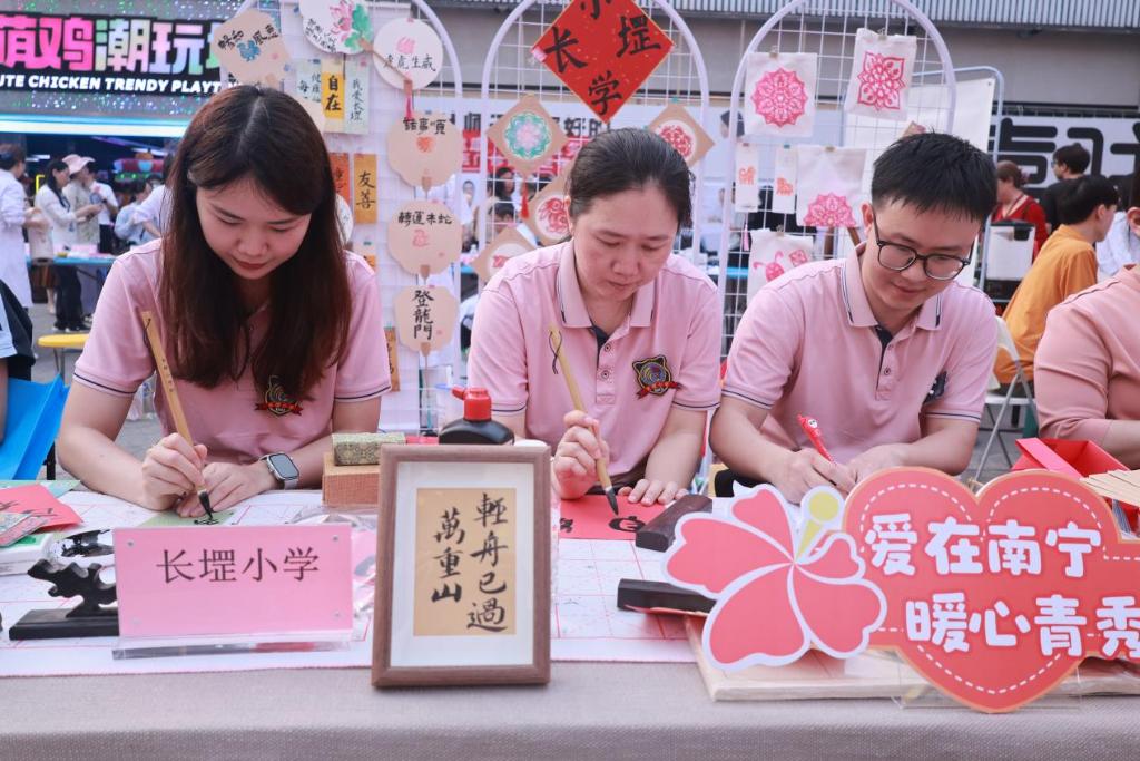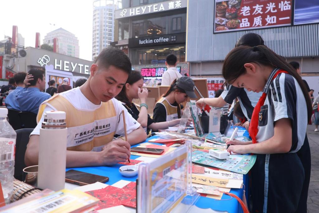 活动现场,国潮文化体验区成为人气焦点。南宁市青秀区长堽小学师生带来的特色剪纸展览与互动体验吸引众多亲子家庭参与,一幅幅精巧的剪纸作品展现传统技艺之美;书法爱好者们挥毫泼墨,以“国潮”为题的创意书法作品引得居民驻足赞叹;非遗油茶传承人现场制作并分享油茶,香气四溢的民俗美食让市民沉浸式感受舌尖上的美好。