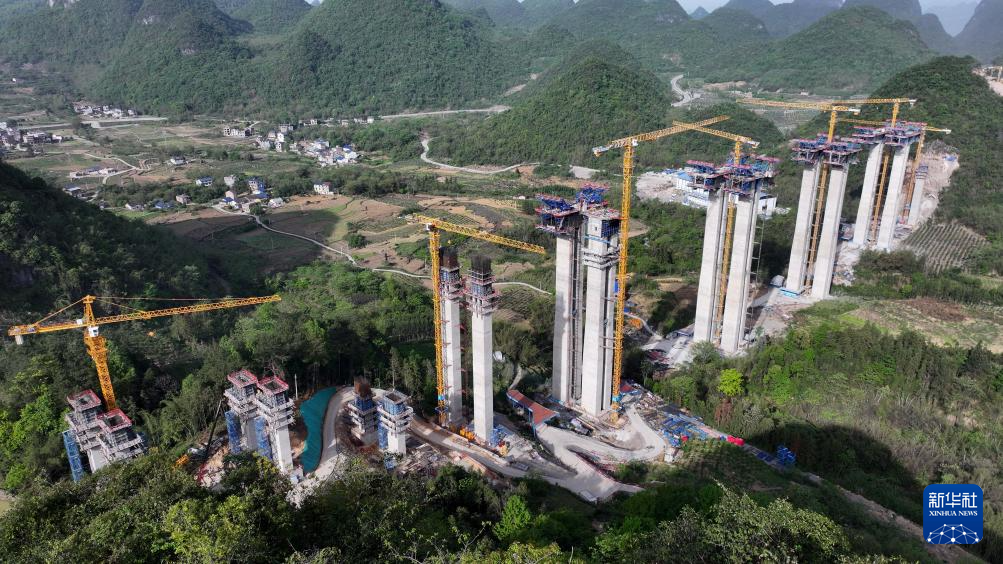 4月14日,工人在融福高速公路广西融安县泗顶镇桐木河特大桥建设工地施工作业(无人机照片)。