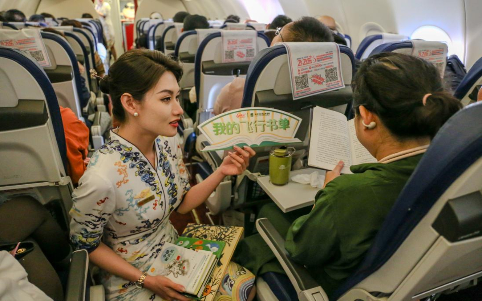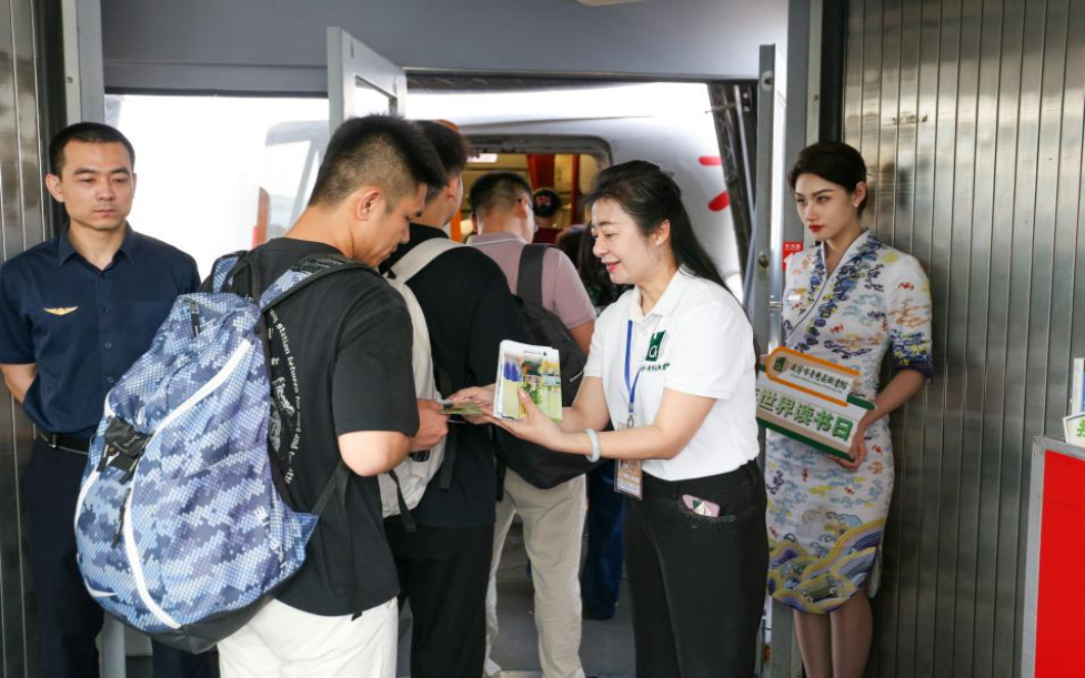4月23日是世界读书日,南宁市青秀区图书馆与北部湾航空携手合作,在GX8825南宁-洛阳航班上共同举办了一场主题为“云端书香同航”的空中读书会,将阅读场景延伸至万米高空,为旅客带来一场别开生面的文化之旅。