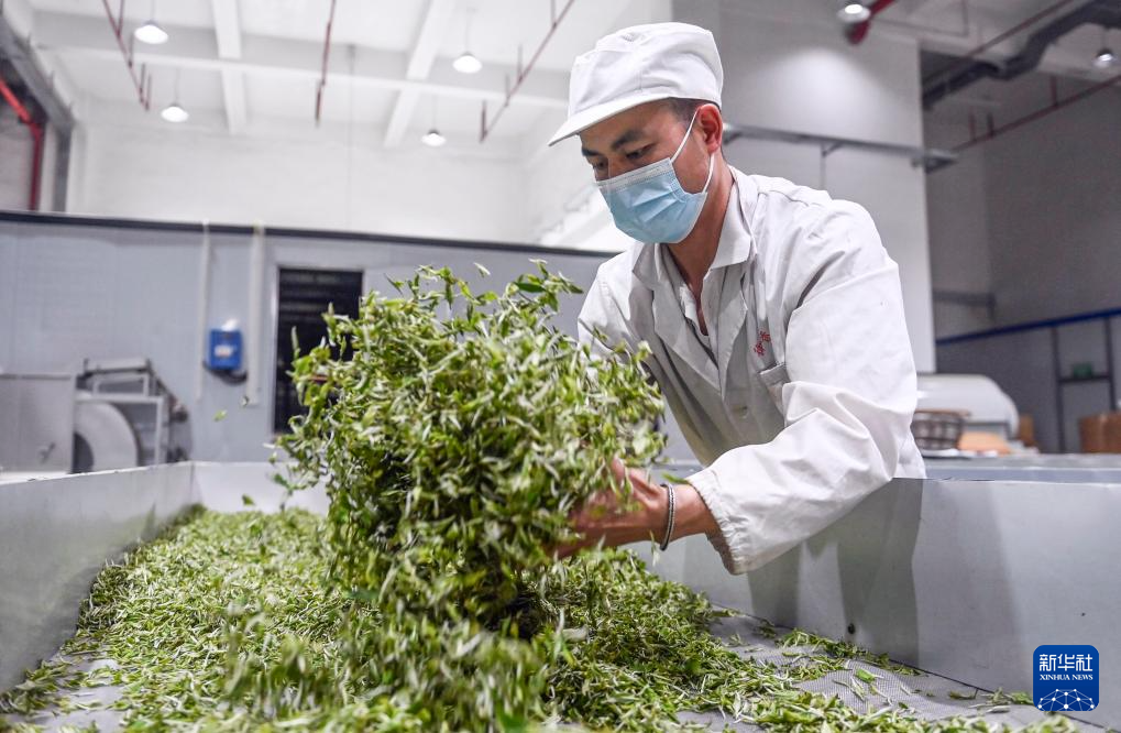 工人在曹丽琼经营的三江御香茶业有限公司制茶车间制作早春茶(3月23日摄)。