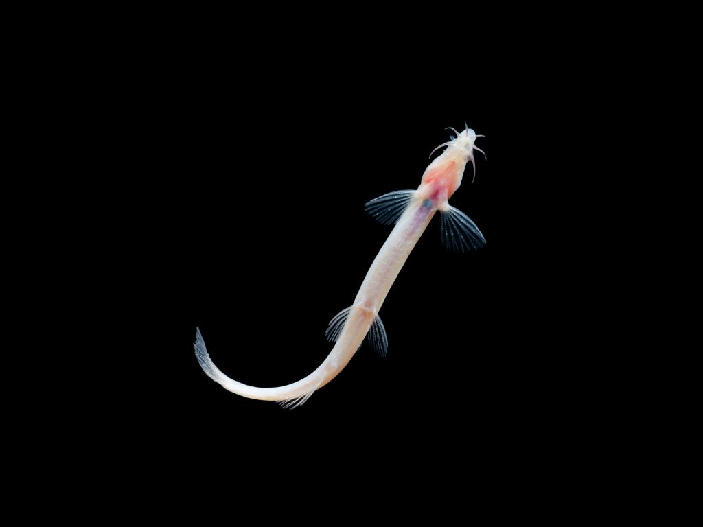 据了解,原花鳅属鱼类为典型的洞穴鱼类。与地表鱼类相比,其眼睛已彻底消失或仅残存一个细小的眼点,晶状体缺失。由于生长在黑暗的洞穴环境中缺乏光照,原花鳅属鱼类体内生成色素的基因表达不活跃或无法表达,因此身体透明,血管和内脏团清晰可见。
