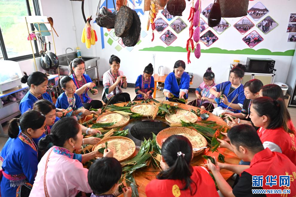 5月23日,在广西柳州市三江侗族自治县古宜镇江川小学,学生、家长一起学习制作三江粽。