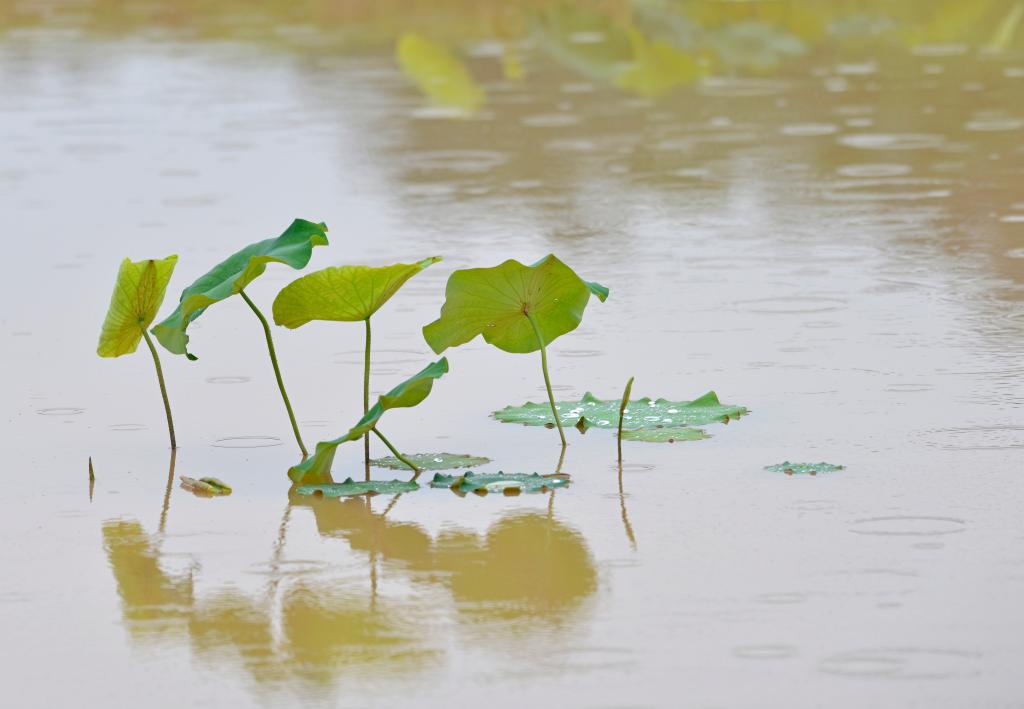 ↑2025年5月25日在广西南宁市邕宁区顶蛳山田园风光区拍摄的雨中荷叶。CICPHOTO/滕忠 摄