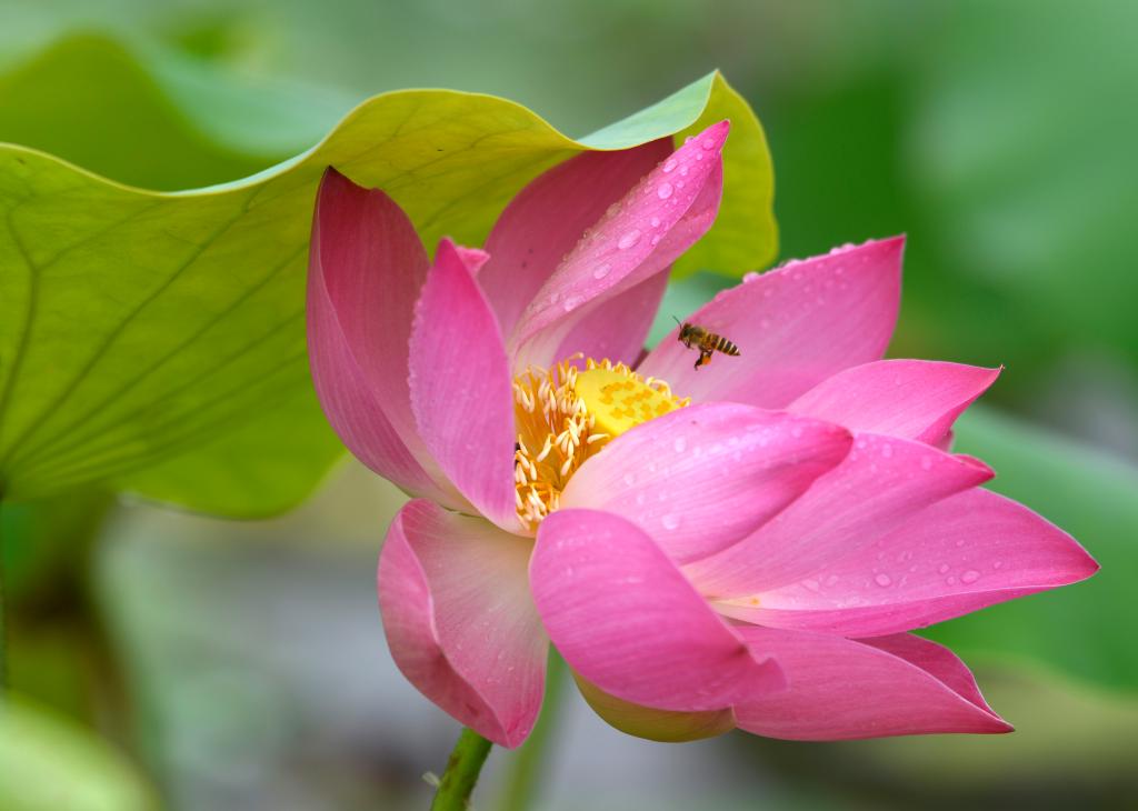 ↑2025年5月25日,广西南宁市邕宁区顶蛳山田园风光区,一只蜜蜂在荷花上飞舞。CICPHOTO/滕忠 摄