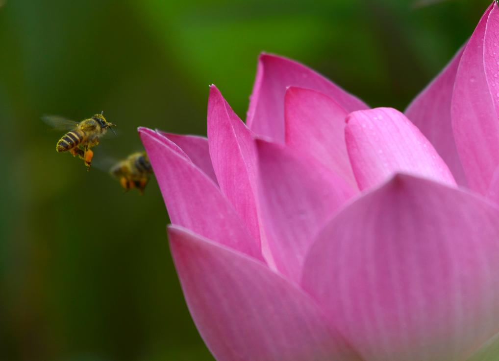 ↑2025年5月25日,广西南宁市邕宁区顶蛳山田园风光区,蜜蜂在荷花上飞舞。CICPHOTO/滕忠 摄 编辑:张雪萌