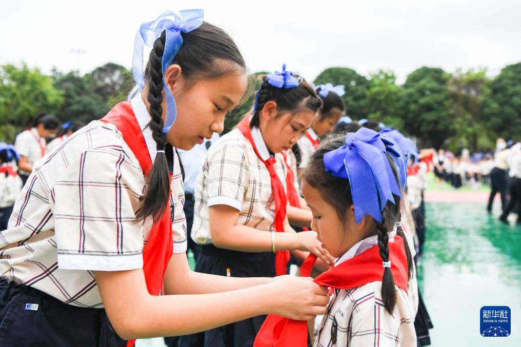 5月30日,在广西南宁市滨湖路小学教育集团滨湖校区少先队员入队仪式上,高年级学生为新队员戴红领巾。