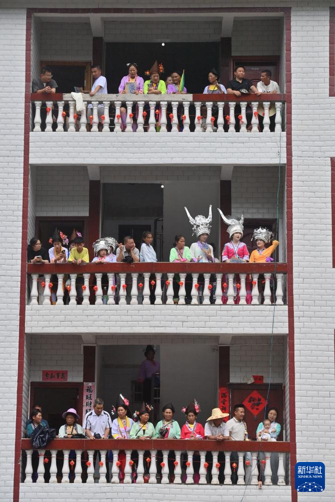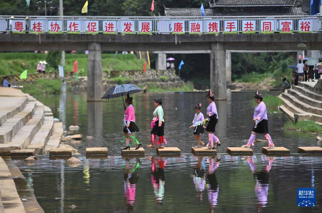 7月10日,在融水苗族自治县红水乡良双村,村民前去参加闹鱼节活动。当地利用粤桂协作资金,不断提升闹鱼节活动基础设施条件,增强游客和村民的体验感。