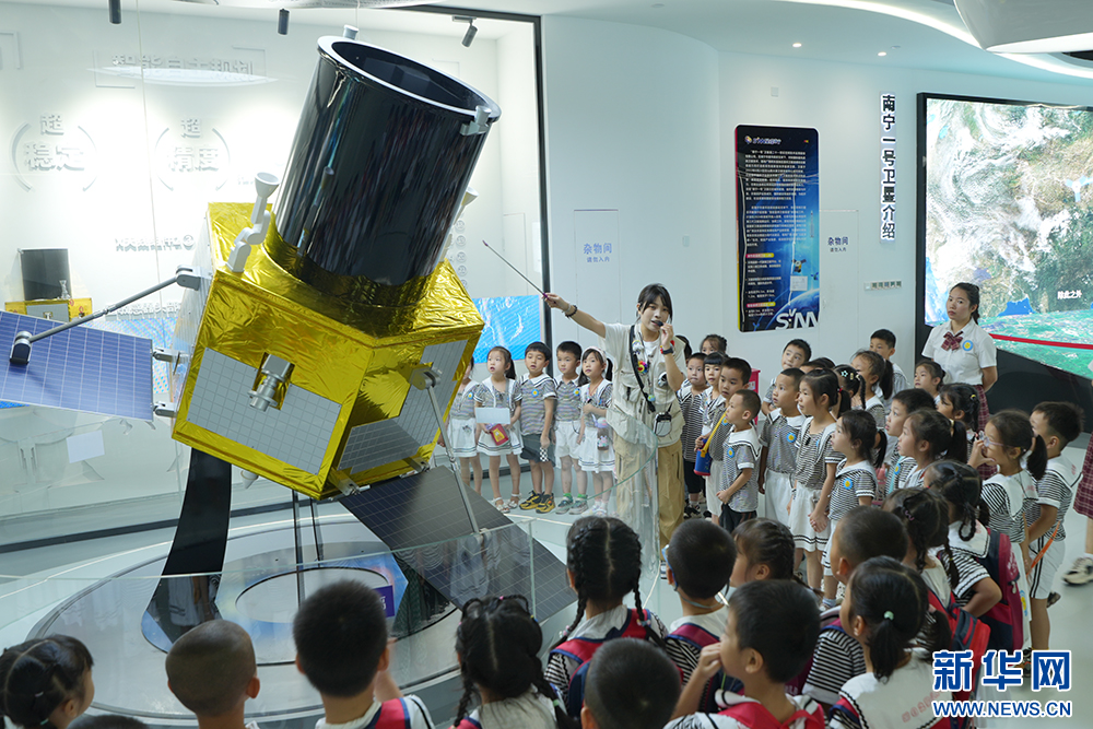 在南宁市良庆区星耀南宁科学馆,学生在听讲解员介绍广西第一颗卫星。