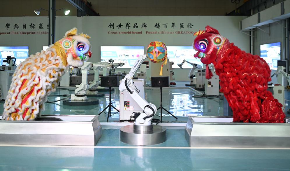 位于揭阳的巨轮智能装备股份有限公司的工业机器人舞狮(6月29日摄)。新华社记者 邓华 摄