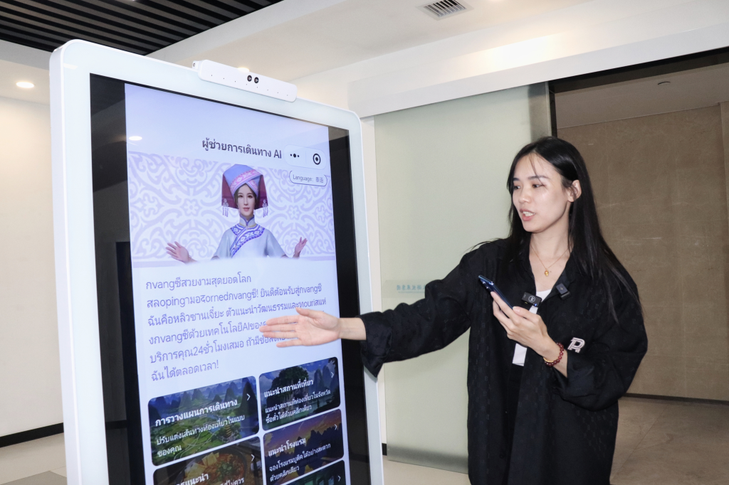 广西旅发新媒体运营有限公司新媒体事业群总监范舒婷在介绍泰语版“三姐伴游”。李宇安 摄