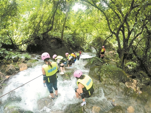 游客在河池南丹丹炉山景区体验溪降项目。 (丹炉山景区供图)