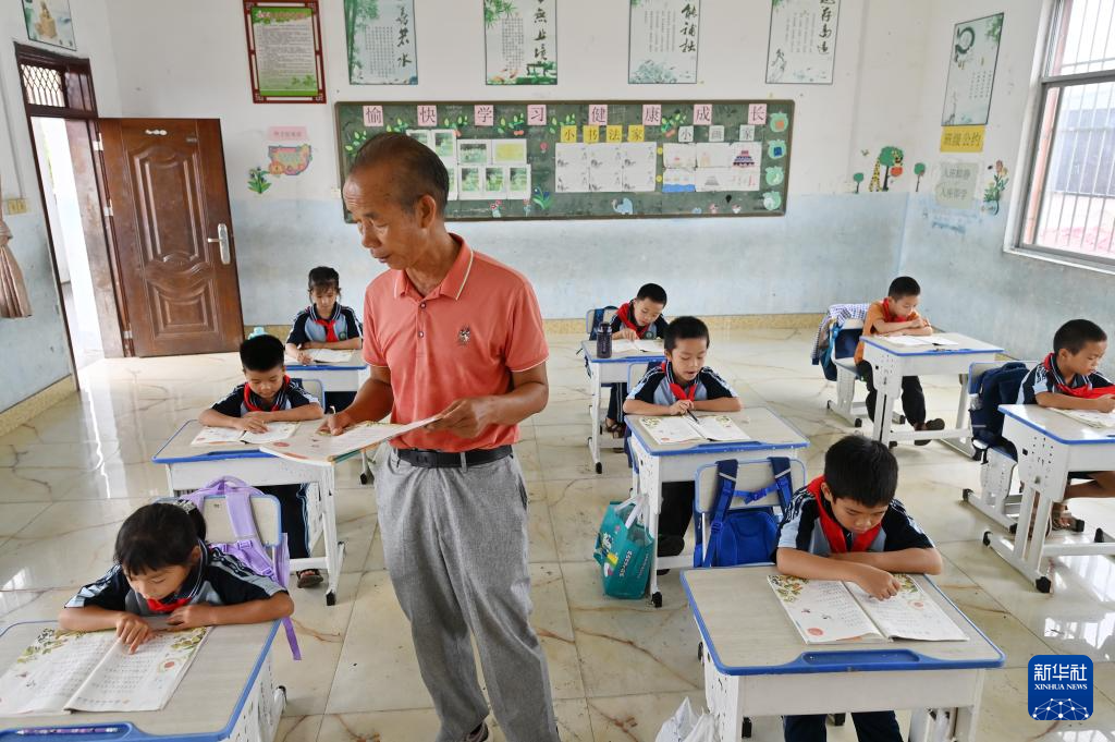 这个学期,年过60岁的王英红老师主动向当地教育主管部门提出申请,又回到讲台上继续给学生上课。现在,七新教学点有小学一二年级共15名学生,王老师担任二年级班主任,上二年级语文课和一年级数学课,还兼任两个年级的音乐课和体育课。