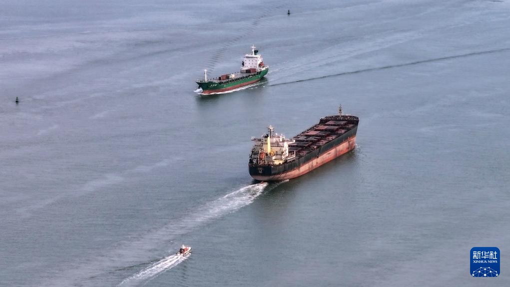 这是一艘海轮驶离钦州港(9月16日摄,无人机照片)。