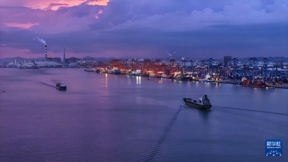 这是黄昏时分的钦州港,海轮往来穿行运输货物(9月16日摄,无人机照片)。