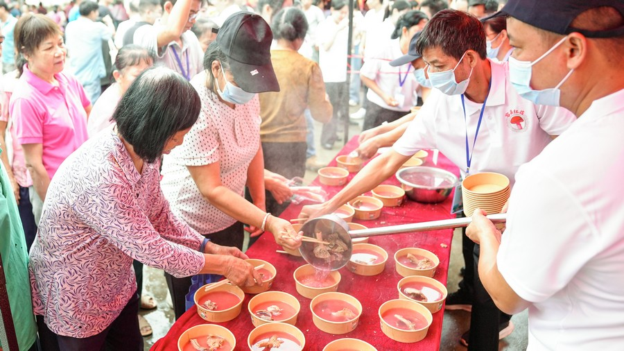 游客在品尝红菇汤羹。