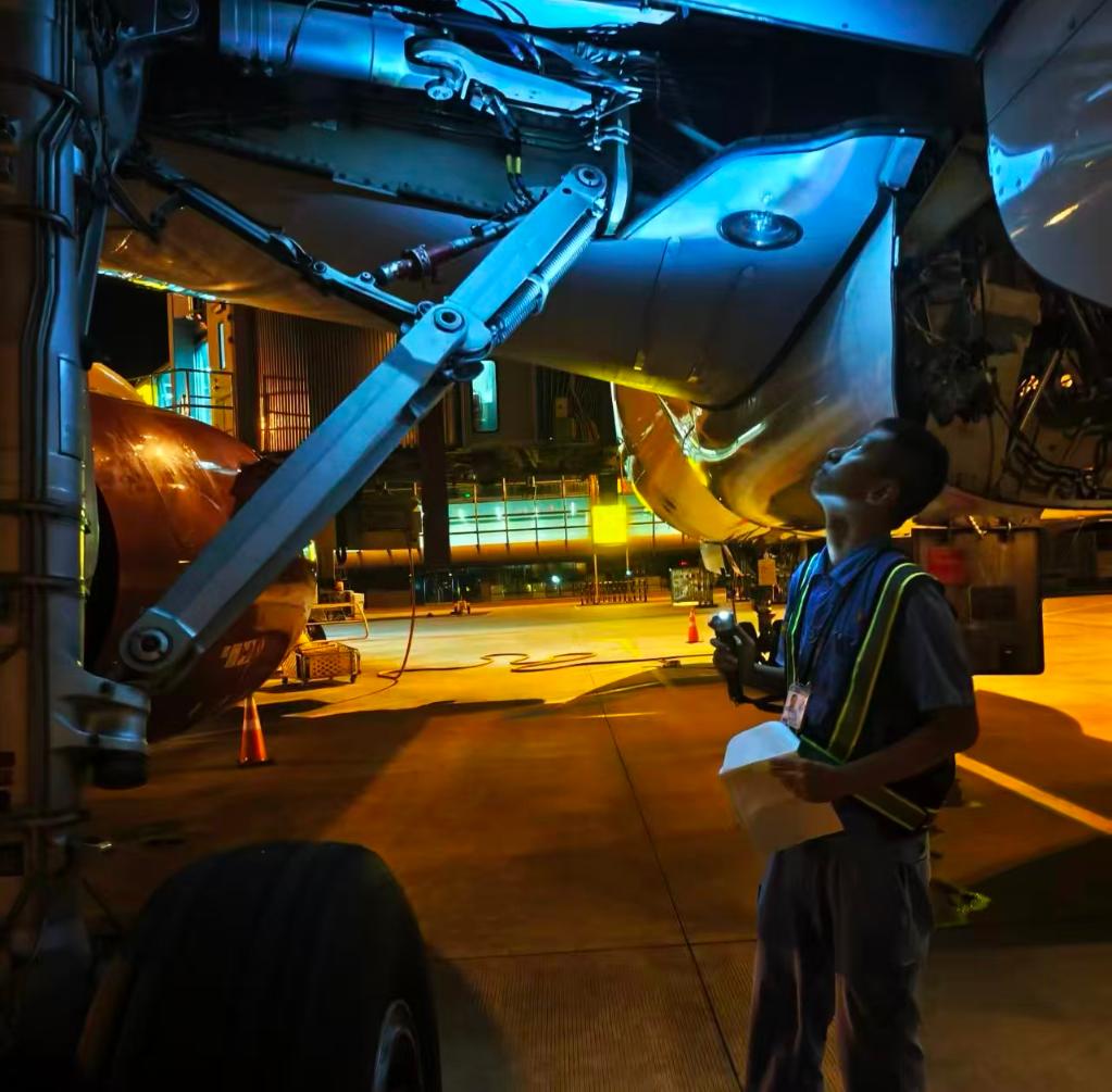 夜幕低垂,随着最后一架进港航班落地,热闹喧嚣的航站楼归于寂静,但对于夜班机务人员来说,工作才刚刚开始。机务人员吴国葆手持工具箱开始对停场过夜飞机进行航后检查,“我们需严格按照检查单内容,有序对飞机实施全面检查,特别是重点处理发现的故障以及过站的保留项目,确保飞机在次日运营过程中安全可靠。”吴国葆说。