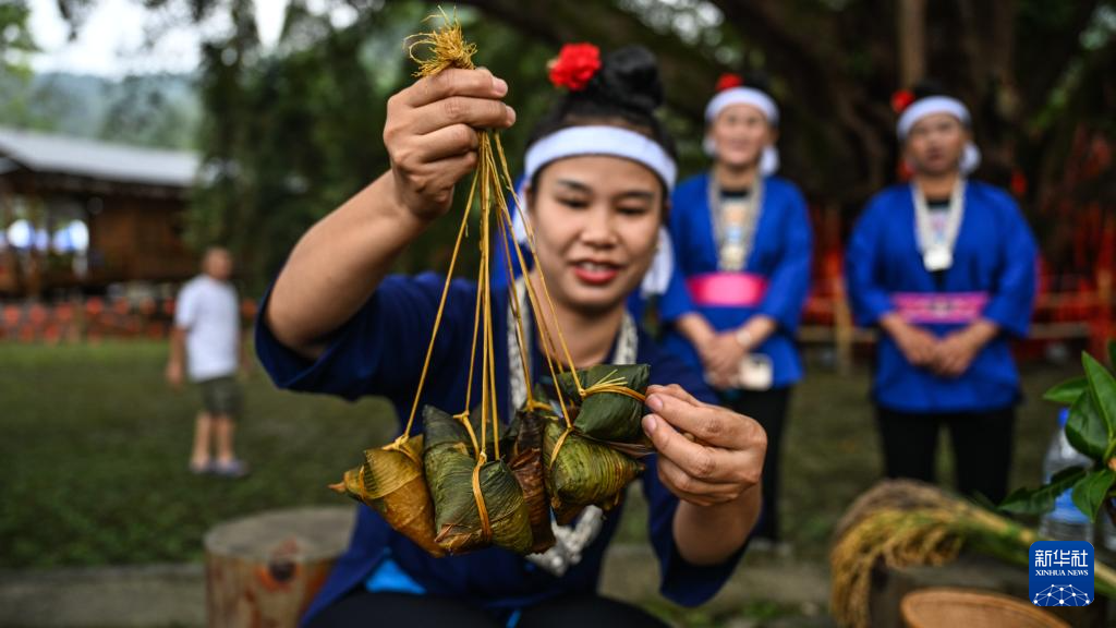 10月17日,在良口乡产口村活动现场,一名侗族妇女在整理制作的粽子。
